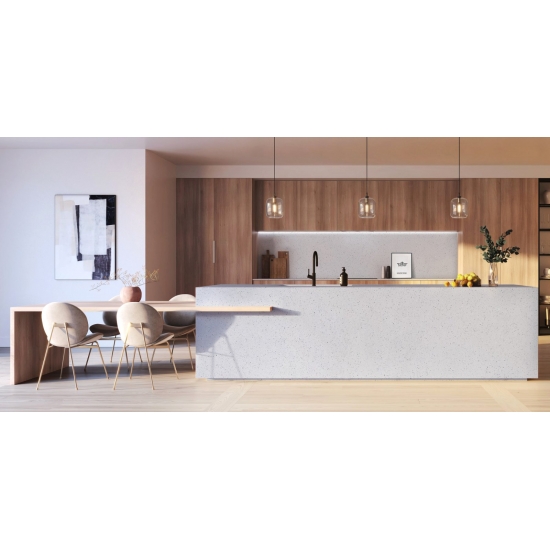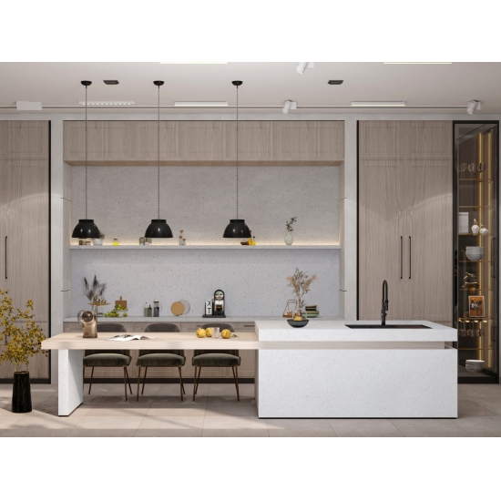 1001 闪亮白石英 这款石英石呈现出纯净透亮的质感,其亮白的底色上点缀着闪烁的矿物颗粒。表面散发着优雅的气息,微妙的光泽从各个角度捕捉光线,增添了空间的层次感和精致感。这款石英石旨在以其简洁精致的外观提升任何空间,是现代台面、盥洗台和特色装饰面的理想之选。