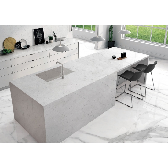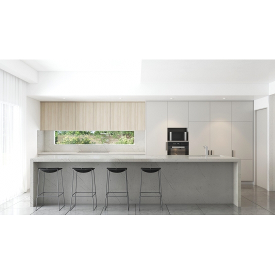 4005 比安卡维诺大理石石英板 这款石英石台面呈现出精致优雅的美感,柔和的白色底色上点缀着流畅细腻的灰色纹理。微妙的大理石纹理营造出动感与自然和谐之美,赋予台面洁净而奢华的气质。它散发着永恒的精致感,兼具简约与个性,是提升现代和古典室内装饰的理想之选,能为空间增添明亮、优雅和高贵的格调。