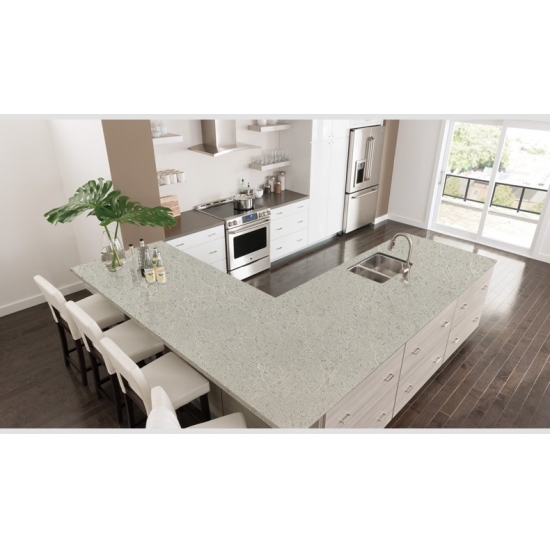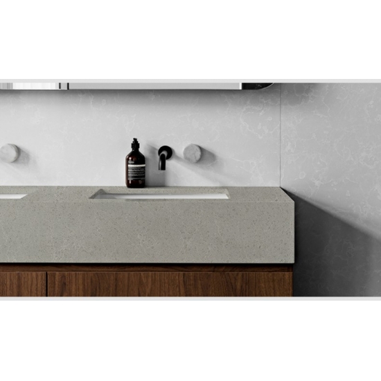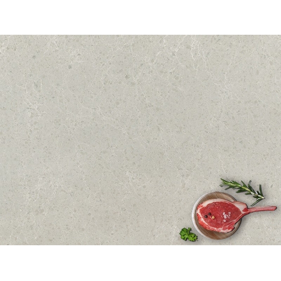 4010 细雨大理石石英板 这款石英石台面展现出精致优雅的外观,柔和的白色背景上点缀着细腻的灰色纹理,流畅地贯穿整个表面。其微妙的大理石纹理营造出宁静轻盈的美感,带来平衡感和自然动感。这款石英石散发着低调奢华的气息,是追求简洁、永恒和精致外观空间的理想之选。