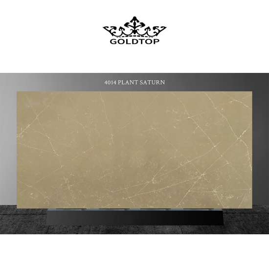 4014 植物土星大理石石英 这款石英石板材展现出优雅精致的外观,柔和的奶油色底色上点缀着灰色和淡金色交织的纹理,更添美感。错综复杂的纹理营造出自然的动感和层次感,赋予表面精致的大理石质感。这款石英石板材旨在提升任何空间的格调,为台面、盥洗台或特色墙增添永恒的奢华和低调的富丽堂皇之感。