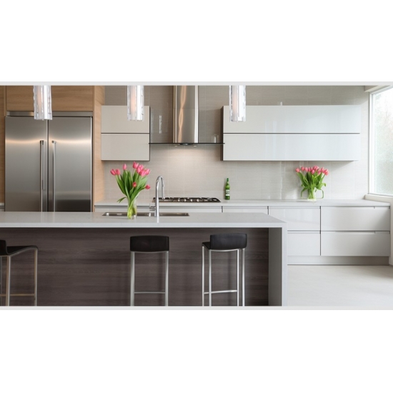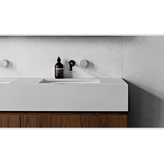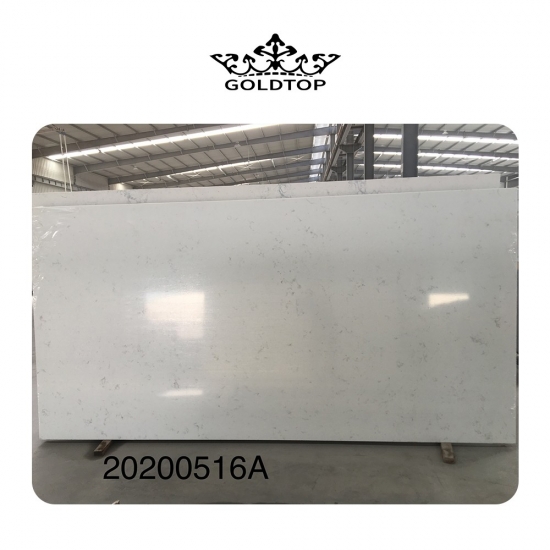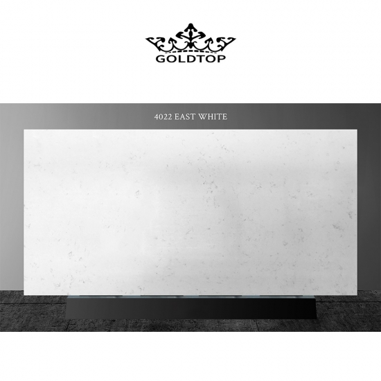 4022 东白大理石石英 这款石英石以其纯净优雅的外观而著称,亮白的底色上点缀着柔和流畅的纹理。细腻的纹理在石板上轻轻交织,营造出流动自然的动感,令表面散发出精致高贵的气息。这款石英石旨在提升任何室内空间的格调,为台面、盥洗台和特色墙增添永恒的精致与奢华感。