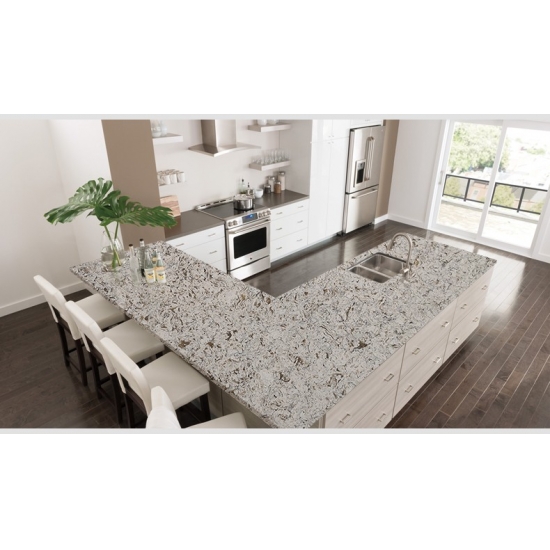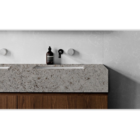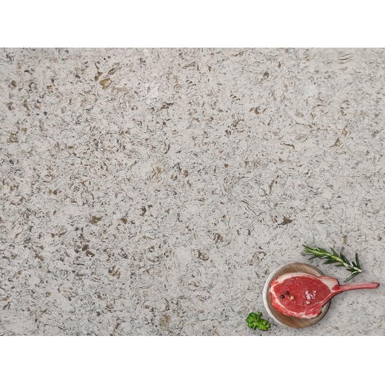 4026 米色河大理石石英 这款石英石板材以温暖优雅的米色为底,点缀着柔和的奶油色和淡雅的灰褐色纹理。表面散发着自然的精致感,柔和的纹理营造出动感和深度,令人联想起宁静的河床。这款石英石板材旨在为任何空间带来永恒的美感和低调的奢华,无论安装在哪里,都能营造出精致而温馨的氛围。