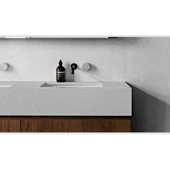 4032 粗粒卡拉拉大理石石英 这款石英石台面展现出永恒优雅的外观,柔和的白色背景上点缀着粗犷的灰色纹理,灵感源自天然卡拉拉大理石。纹理清晰流畅地贯穿整个台面,赋予其精致而动感的质感,增添了空间的层次感和自然的动感。这款石英石台面旨在呈现经典大理石的美感,同时兼具卓越的耐用性,是现代和传统空间的理想之选,更能提升整体的精致格调。