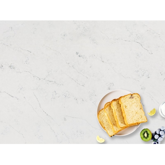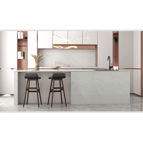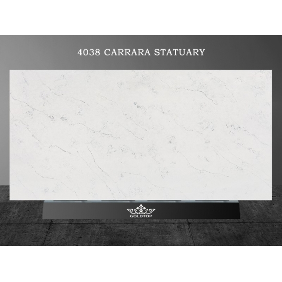 4038 卡拉拉雕像大理石石英 这款石英石台面外观精致优雅,柔和的白色背景上点缀着优美的灰色纹理,灵感源自天然雕塑大理石。纤细的纹理自然流畅地贯穿整个台面,营造出动感和层次感,赋予其永恒的精致感。这款石英石旨在为任何空间带来明亮奢华的氛围,是厨房、浴室以及高端住宅或商业空间的理想之选。