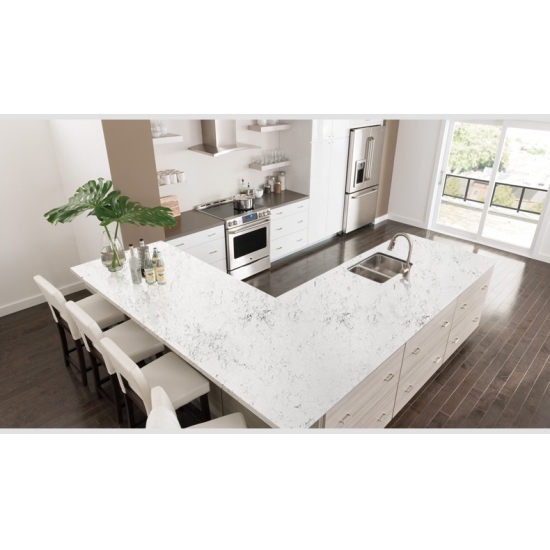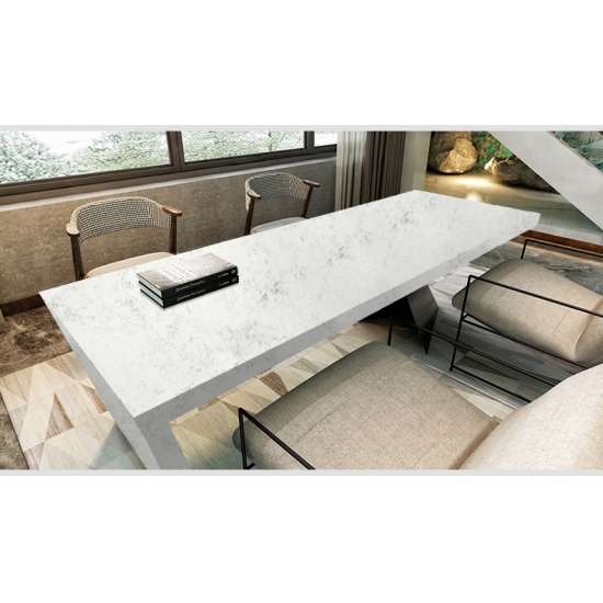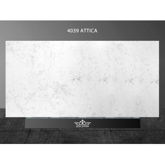 4039 阿提卡大理石石英石板 这款石英石台面以柔和的白色为底,点缀着精致的灰色纹理,展现出优雅高贵的气质。表面呈现出简洁永恒的美感,柔和的大理石纹理自然流畅地贯穿整个台面,营造出平衡和谐的视觉效果。这款石英石台面体现了低调奢华的理念,是现代和古典空间的理想之选,能够为任何室内空间增添明亮而精致的气息。