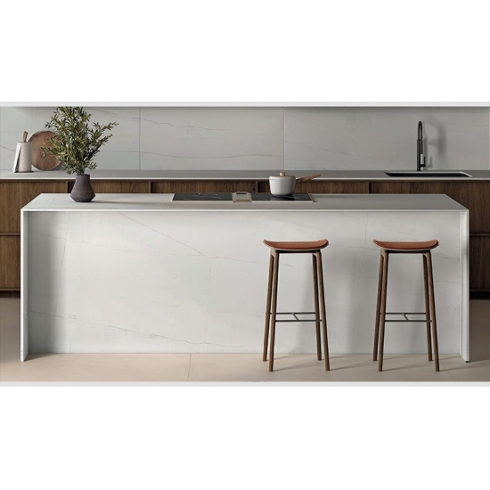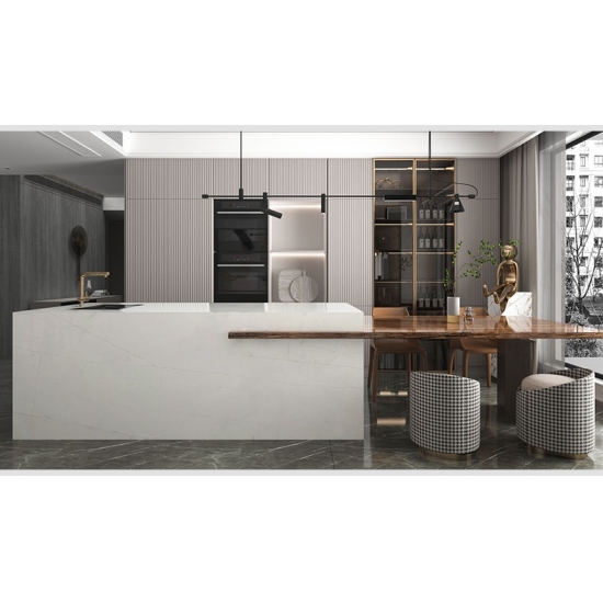 5006 卡拉卡塔祖母绿石英石拥有醒目的白色底面,其上点缀着深邃的祖母绿纹理。这种鲜明的对比营造出引人入胜的视觉深度和动感活力。这款石板体现了奢华的现代感,能够为任何当代设计增添强大的视觉冲击力,并为空间注入活力四射的精致格调。