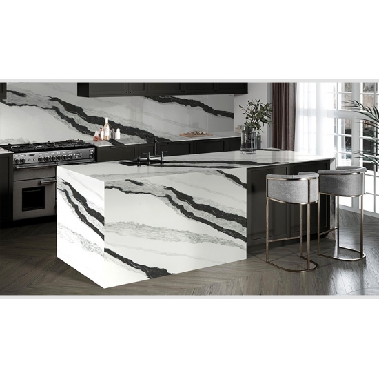 5008熊猫白石英石板材呈现出简洁现代的美感,明亮的白色底色上点缀着柔和的灰色纹理。细腻的纹理与底色交相辉映,营造出一种静谧的层次感和动感。这款板材散发着永恒的优雅气质,是打造现代空间宁静精致氛围的理想之选。
