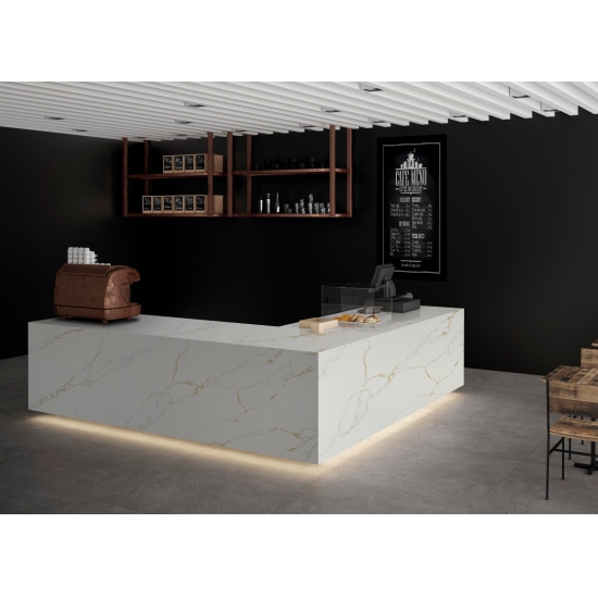 卡拉卡塔系列石英石是目前最受欢迎的石英石产品。精致独特的卡拉卡塔石英石以其纯净的白色和引人注目的通体大理石纹理令人惊艳。它拥有美丽醒目的宽纹理图案和奢华的质感。这款石英石拥有卡拉卡塔大理石的天然外观,却没有任何大理石台面的缺点。卡拉卡塔石英石非常耐用,防污防刮,因此也是厨房和浴室台面、楼梯、窗台、定制家具、室内外墙面和地面、水刀切割图案以及其他设计项目的理想之选。