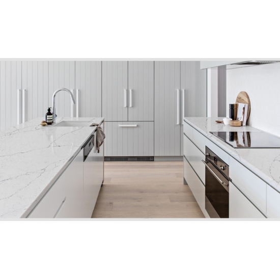 5021 Alasky石英石板材以宁静的白色为底,饰以柔和的灰色纹理,优雅别致。这种微妙的色彩交融营造出平静轻盈的美感,并展现出精致自然的韵味。这款板材用途广泛,经久耐用,能够轻松为现代和传统空间注入清新优雅的气息。
