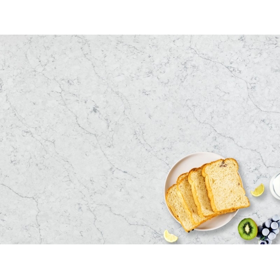 5029 Destiny 石英石拥有引人注目的深色底纹,与大胆明亮的纹理交织在一起,形成鲜明对比,营造出动感十足的视觉冲击力。这款石英石板材体现了现代奢华与自信风格,是打造现代室内设计中精致视觉焦点的理想之选。