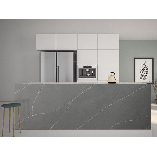 5128 Fior Bosco 石英石展现出精致的灰色底色,其上优雅地勾勒出细腻的有机纹理,令人联想起宁静的森林美景。每一块石板都呈现出独特的色调层次和流畅的纹理,为任何室内空间带来现代而宁静的氛围。其光泽的表面增强了光线反射,营造出动感的视觉效果,是厨房台面、浴室盥洗台和特色墙的理想之选。