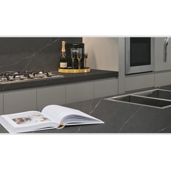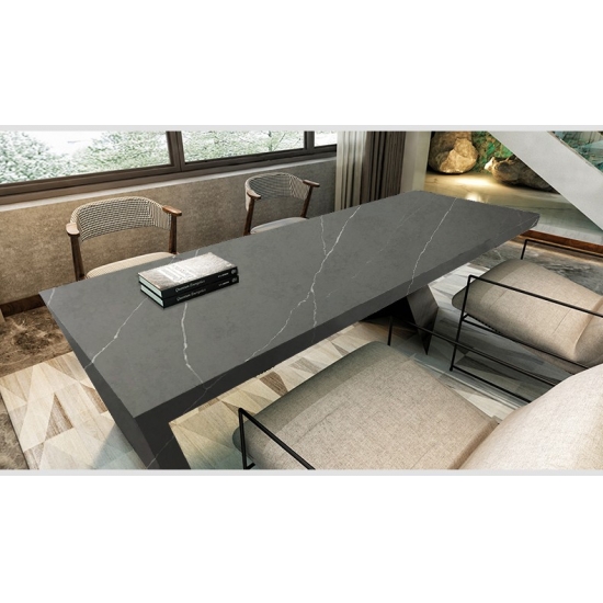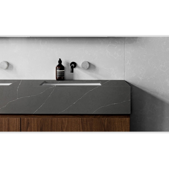 5032 钢化石英石板材展现出大胆而动感的风格,深炭灰色底色上点缀着醒目的白色纹理。高对比度的图案营造出强烈的活力和现代感。这款板材具有强大的视觉冲击力,是打造现代风格和个性鲜明室内设计的理想之选,可为任何空间增添一抹戏剧性的精致感。
