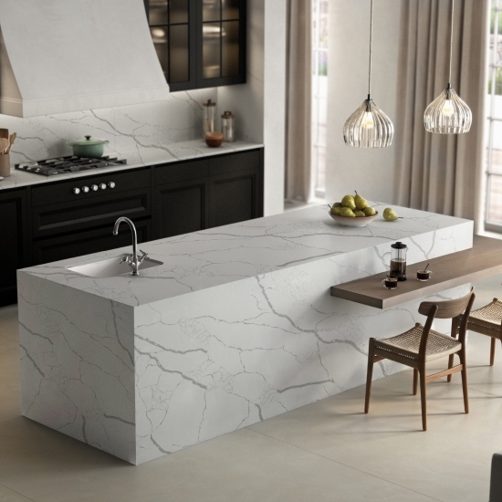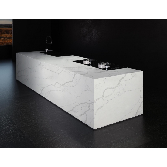 卡拉卡塔系列石英石是目前最受欢迎的石英石产品。精致独特的卡拉卡塔石英石以其纯净的白色和引人注目的通体大理石纹理令人惊艳。它拥有美丽醒目的宽纹理图案和奢华的质感。这款石英石拥有卡拉卡塔大理石的天然外观,却没有任何大理石台面的缺点。卡拉卡塔石英石非常耐用,防污防刮,因此也是厨房和浴室台面、楼梯、窗台、定制家具、室内外墙面和地面、水刀切割图案以及其他设计项目的理想之选。