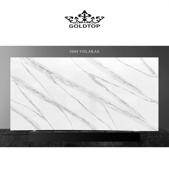 5044 Volakas 白色卡拉卡塔石英石凭借其永恒的优雅和百搭的设计,适用于各种用途。这款抛光石英石常用于厨房台面、浴室盥洗台和防溅板,其洁白的表面搭配柔和的灰色纹理,更添一份精致优雅。它也完美适用于住宅和商业空间的墙面和地面铺装。