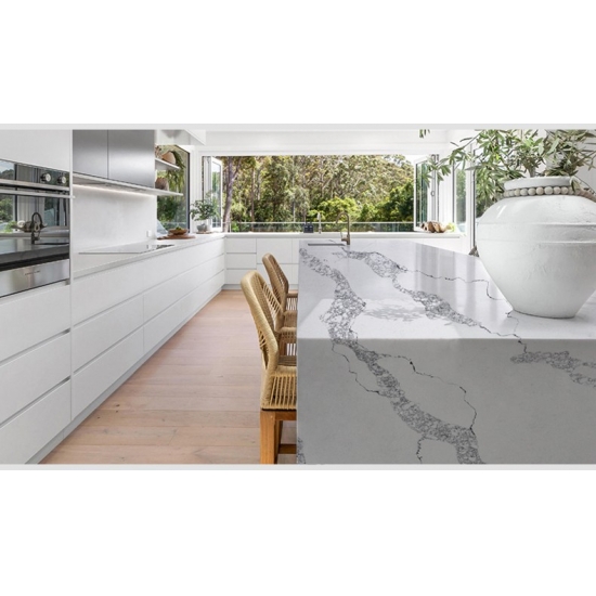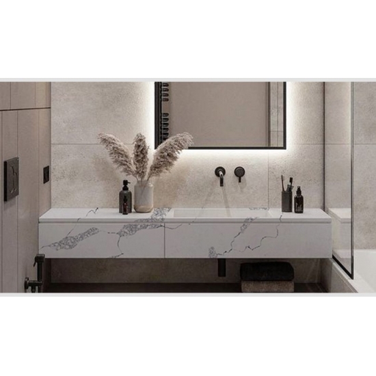 5046 Nuvo石英石板材呈现出简洁现代的美感,洁白的底色上点缀着柔和的灰色纹理。光影交错,营造出宁静深邃的现代优雅氛围。这款板材用途广泛,能够完美融入简约或设计感十足的空间,营造出精致静谧的氛围。