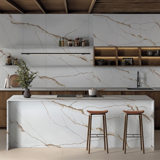 卡拉卡塔石英石(Brittanicca Gold),卡拉卡塔系列石英石是目前最受欢迎的石英石产品。精致独特,卡拉卡塔石英石以其纯净的白色和引人注目的通体大理石纹理令人惊艳。