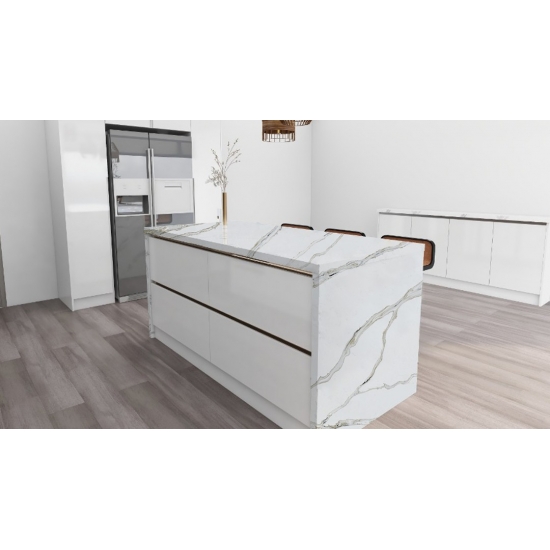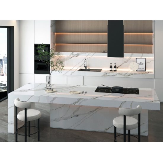 卡拉卡塔系列石英石是目前最受欢迎的石英石产品。精致独特的卡拉卡塔石英石以其纯净的白色和引人注目的通体大理石纹理令人惊艳。它拥有美丽醒目的宽纹理图案和奢华的质感。这款石英石拥有卡拉卡塔大理石的天然外观,却没有任何大理石台面的缺点。卡拉卡塔石英石非常耐用,防污防刮,因此也是厨房和浴室台面、楼梯、窗台、定制家具、室内外墙面和地面、水刀切割图案以及其他设计项目的理想之选。