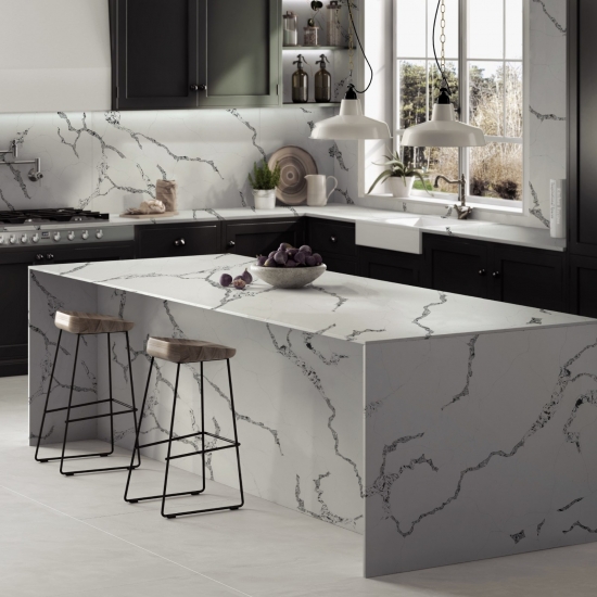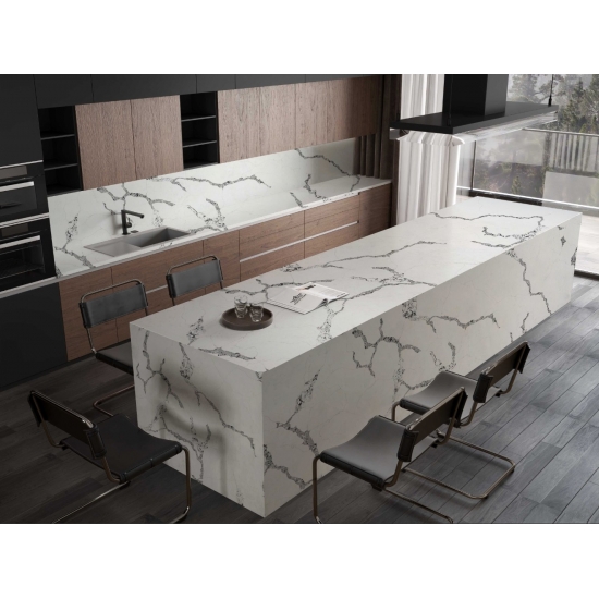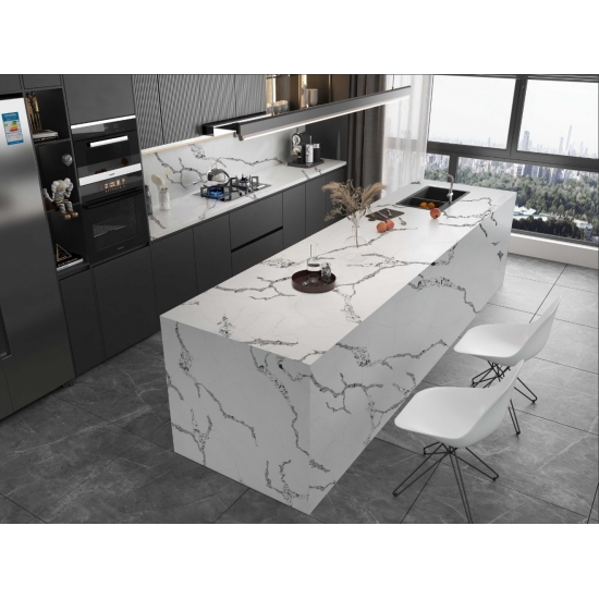 卡拉卡塔系列石英石是目前最受欢迎的石英石产品。精致独特的卡拉卡塔石英石以其纯净的白色和引人注目的通体大理石纹理令人惊艳。它拥有美丽醒目的宽纹理图案和奢华的质感。这款石英石拥有卡拉卡塔大理石的天然外观,却没有任何大理石台面的缺点。卡拉卡塔石英石非常耐用,防污防刮,因此也是厨房和浴室台面、楼梯、窗台、定制家具、室内外墙面和地面、水刀切割图案以及其他设计项目的理想之选。