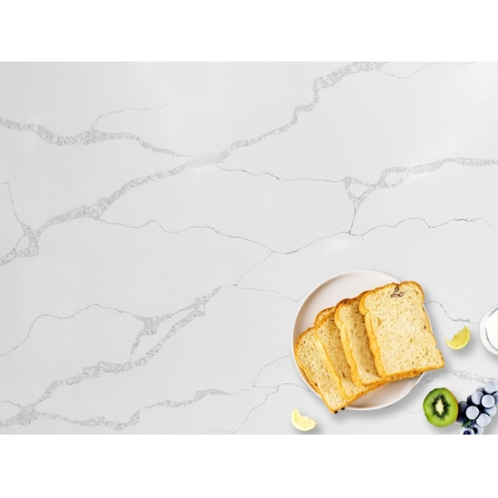 5088 卡拉卡塔特伦托石英石板材呈现出明亮的白色底面,点缀着醒目大胆的灰色纹理。鲜明的对比营造出强烈的层次感和动感。这款板材尽显奢华气派,无论是现代风格还是经典华丽的室内装潢,都能完美融入,彰显精致品味。