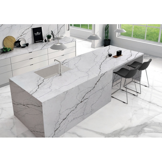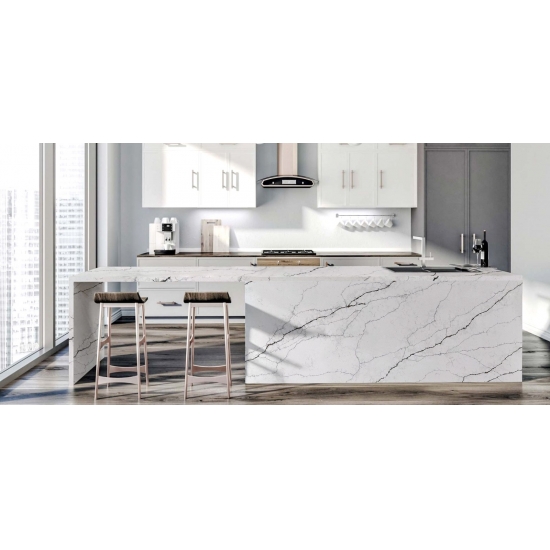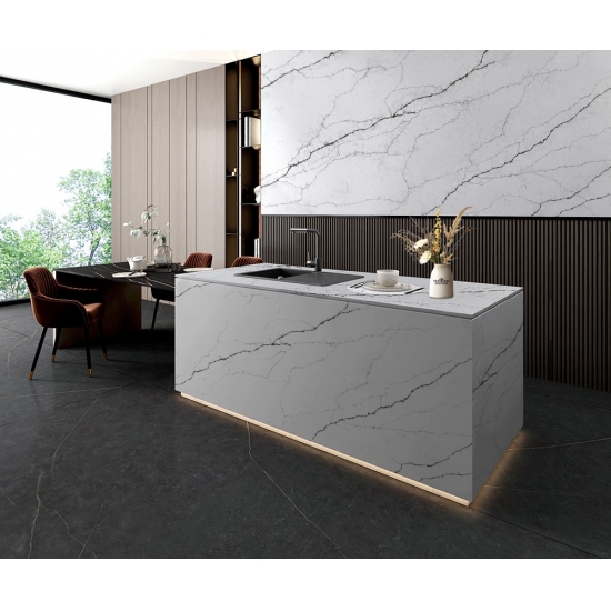 卡拉卡塔系列石英石是目前最受欢迎的石英石产品。精致独特的卡拉卡塔石英石以其纯净的白色和引人注目的通体大理石纹理令人惊艳。它拥有美丽醒目的宽纹理图案和奢华的质感。这款石英石拥有卡拉卡塔大理石的天然外观,却没有任何大理石台面的缺点。卡拉卡塔石英石非常耐用,防污防刮,因此也是厨房和浴室台面、楼梯、窗台、定制家具、室内外墙面和地面、水刀切割图案以及其他设计项目的理想之选。