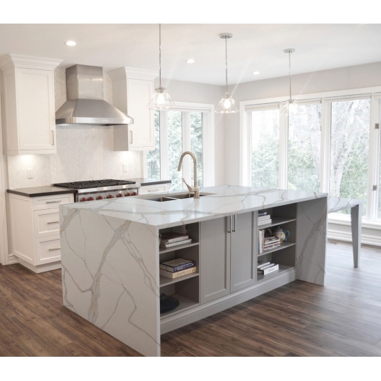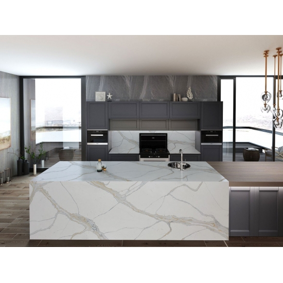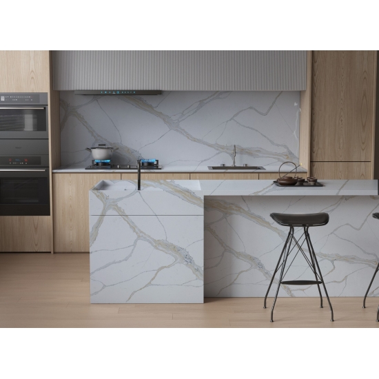 卡拉卡塔系列石英石是目前最受欢迎的石英石产品。精致独特的卡拉卡塔石英石以其纯净的白色和引人注目的通体大理石纹理令人惊艳。它拥有美丽醒目的宽纹理图案和奢华的质感。这款石英石拥有卡拉卡塔大理石的天然外观,却没有任何大理石台面的缺点。卡拉卡塔石英石非常耐用,防污防刮,因此也是厨房和浴室台面、楼梯、窗台、定制家具、室内外墙面和地面、水刀切割图案以及其他设计项目的理想之选。