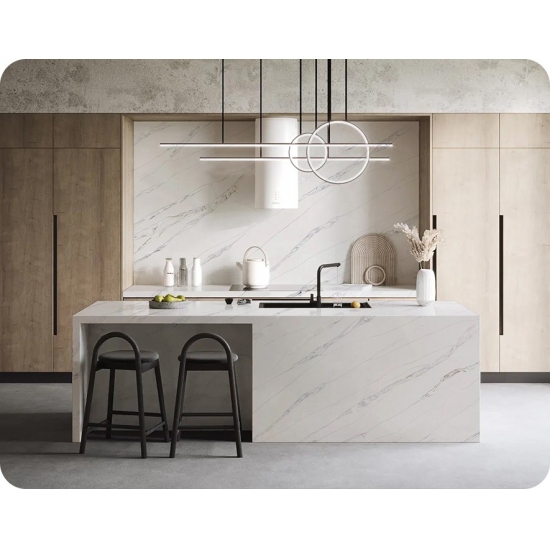卡拉卡塔系列石英石是目前最受欢迎的石英石产品。精致独特的卡拉卡塔石英石以其纯净的白色和引人注目的通体大理石纹理令人惊艳。它拥有美丽醒目的宽纹理图案和奢华的质感。这款石英石拥有卡拉卡塔大理石的天然外观,却没有任何大理石台面的缺点。卡拉卡塔石英石非常耐用,防污防刮,因此也是厨房和浴室台面、楼梯、窗台、定制家具、室内外墙面和地面、水刀切割图案以及其他设计项目的理想之选。