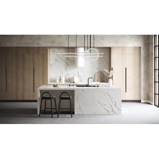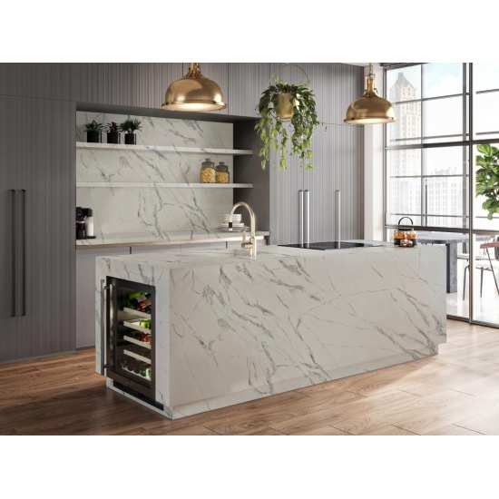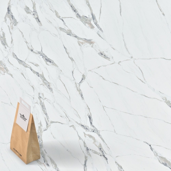 卡拉卡塔系列石英石是目前最受欢迎的石英石产品。精致独特的卡拉卡塔石英石以其纯净的白色和引人注目的通体大理石纹理令人惊艳。它拥有美丽醒目的宽纹理图案和奢华的质感。这款石英石拥有卡拉卡塔大理石的天然外观,却没有任何大理石台面的缺点。卡拉卡塔石英石非常耐用,防污防刮,因此也是厨房和浴室台面、楼梯、窗台、定制家具、室内外墙面和地面、水刀切割图案以及其他设计项目的理想之选。