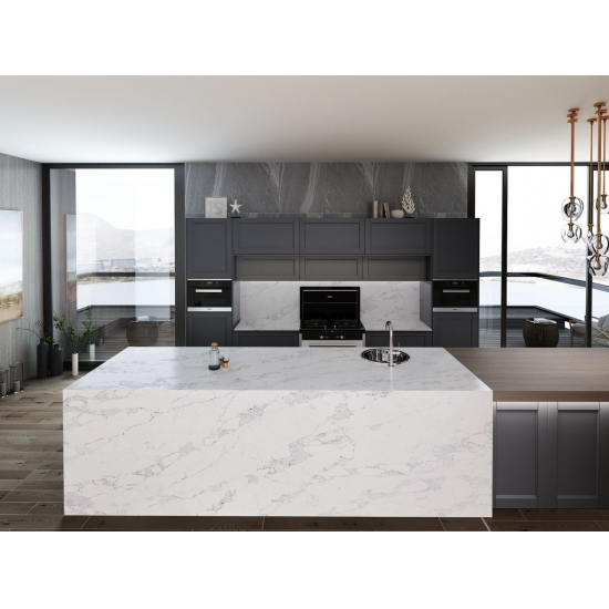 卡拉卡塔系列石英石是目前最受欢迎的石英石产品。精致独特的卡拉卡塔石英石以其纯净的白色和引人注目的通体大理石纹理令人惊艳。它拥有美丽醒目的宽纹理图案和奢华的质感。这款石英石拥有卡拉卡塔大理石的天然外观,却没有任何大理石台面的缺点。卡拉卡塔石英石非常耐用,防污防刮,因此也是厨房和浴室台面、楼梯、窗台、定制家具、室内外墙面和地面、水刀切割图案以及其他设计项目的理想之选。
