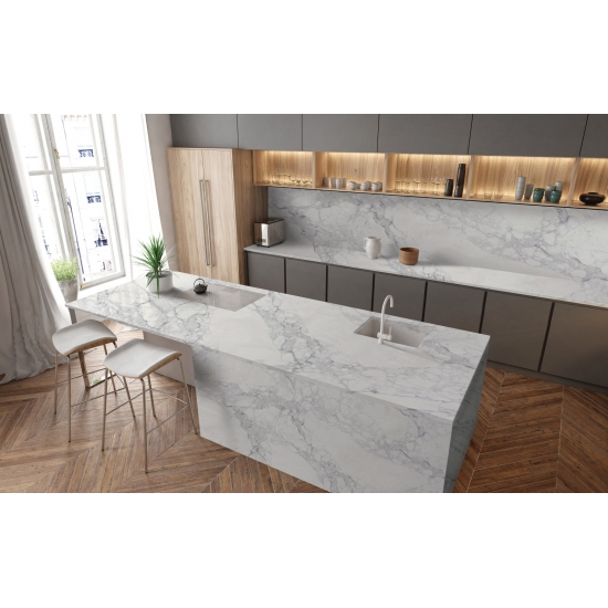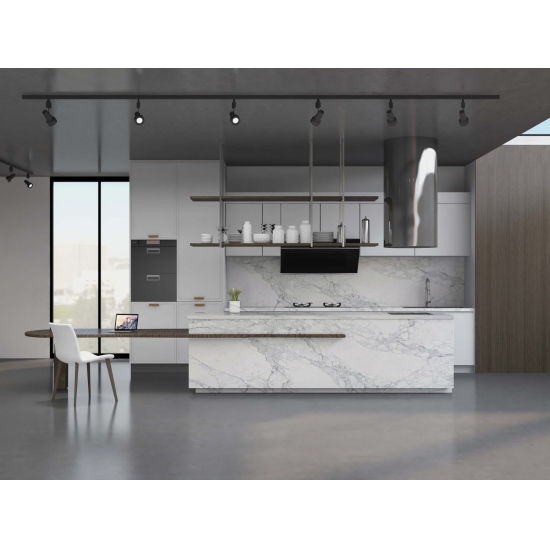 卡拉卡塔系列石英石是目前最受欢迎的石英石产品。精致独特的卡拉卡塔石英石以其纯净的白色和引人注目的通体大理石纹理令人惊艳。它拥有美丽醒目的宽纹理图案和奢华的质感。这款石英石拥有卡拉卡塔大理石的天然外观,却没有任何大理石台面的缺点。卡拉卡塔石英石非常耐用,防污防刮,因此也是厨房和浴室台面、楼梯、窗台、定制家具、室内外墙面和地面、水刀切割图案以及其他设计项目的理想之选。