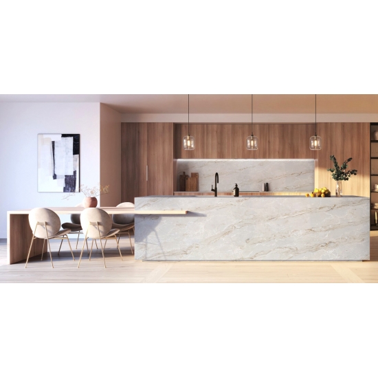 卡拉卡塔系列石英石是目前最受欢迎的石英石产品。精致独特的卡拉卡塔石英石以其纯净的白色和引人注目的通体大理石纹理令人惊艳。它拥有美丽醒目的宽纹理图案和奢华的质感。这款石英石拥有卡拉卡塔大理石的天然外观,却没有任何大理石台面的缺点。卡拉卡塔石英石非常耐用,防污防刮,因此也是厨房和浴室台面、楼梯、窗台、定制家具、室内外墙面和地面、水刀切割图案以及其他设计项目的理想之选。