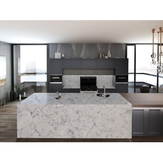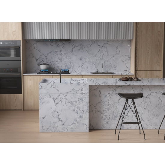 水泥白石英雪花纹理石英是一种经过特殊处理的人造石英石材料。它类似于哑光饰面,混凝土饰面会使石英的颜色与传统的抛光饰面略有不同。这种饰面在花岗岩领域也被称为“拉丝”。