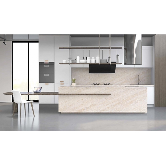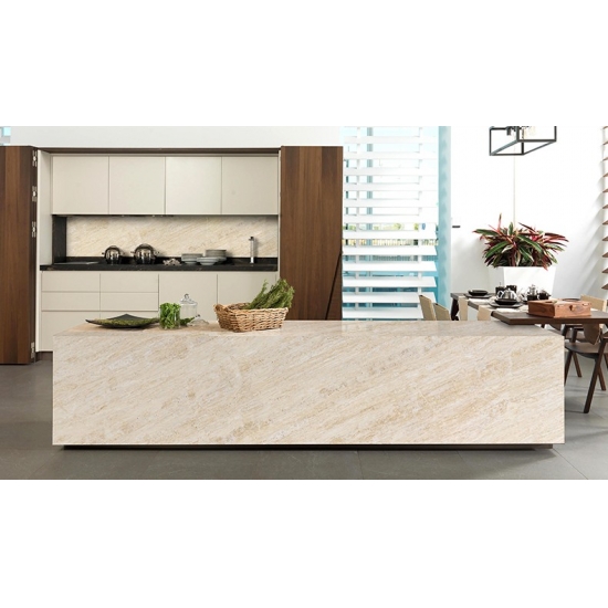 Daino Reale 米色石英石是一款人造石英石,旨在向传奇的意大利石材致敬。它巧妙地再现了天然 Daino Reale 大理石的标志性美感,以温暖的米色为底,饰以优雅的条纹图案,咖啡色、焦糖色和象牙色交织融合。独特的化石状纹理和矿物层理为每块石板增添了视觉上的丰富性和鲜明的个性,将撒丁岛几个世纪以来的优雅与现代设计完美融合,为任何空间注入平衡的温暖感和艺术气息。