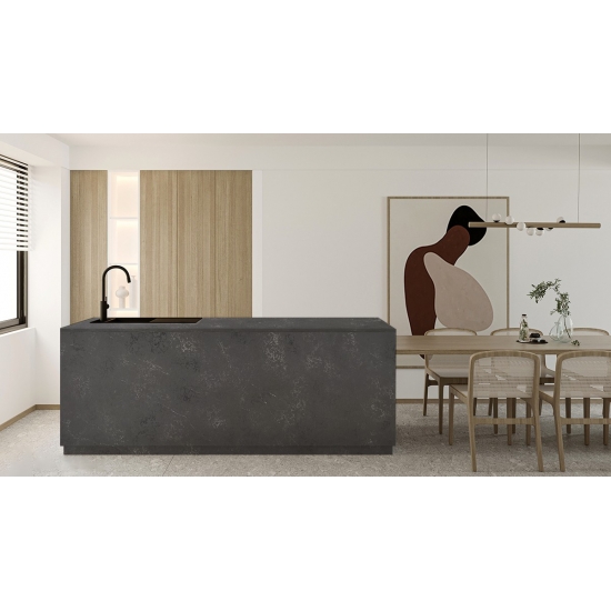 6008 Empira 黑色混凝土石英 混凝土石英石是一种经过特殊处理的人造石英石材料。它类似于哑光饰面,与传统的抛光饰面相比,混凝土饰面会略微改变石英石的颜色。这种饰面在花岗岩领域也被称为“拉丝”。