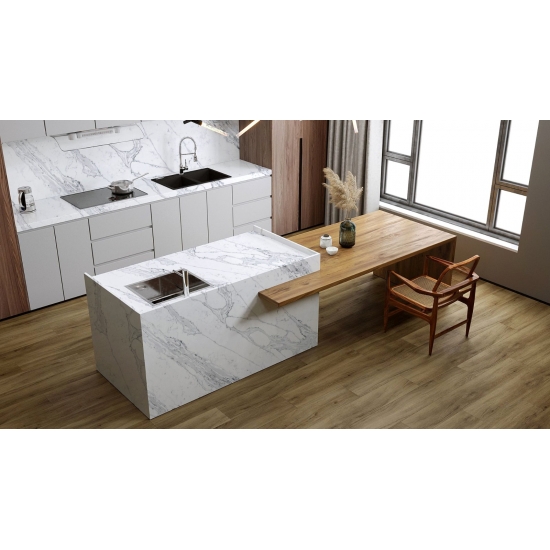 水泥白石英雪花纹理石英是一种经过特殊处理的人造石英石材料。它类似于哑光饰面,混凝土饰面会使石英的颜色与传统的抛光饰面略有不同。这种饰面在花岗岩领域也被称为“拉丝”。