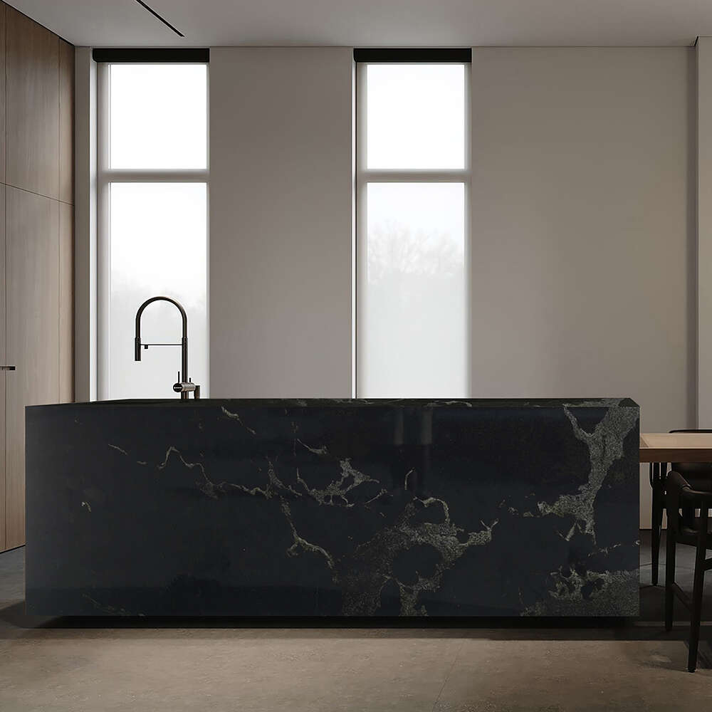 是一种令人惊艳的天然石材,以其深黑色的底色和流畅的银白色纹理而闻名。其纹理如同河流的奔腾,奔放、优雅、隽永。