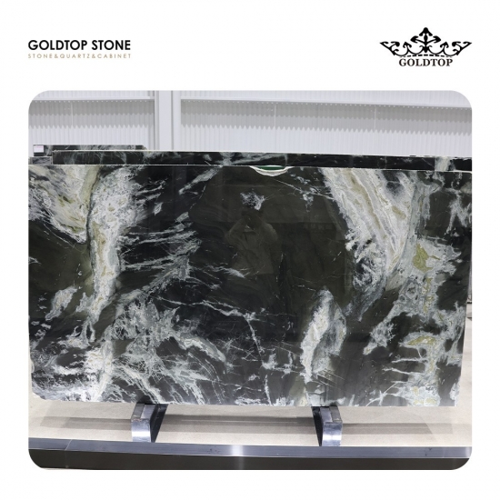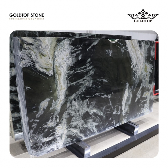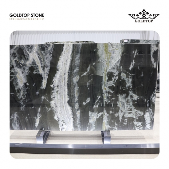 它以深绿色为底,饰以精致的浅绿色纹理。 巴西静谧优雅的绿色石英岩 这款石材捕捉了冬季湖面上冰裂纹的迷人纹理。未经打磨的原始质感增添了一丝野性之美,使其成为台面、盥洗台、特色墙和酒店项目的理想之选。这款经久耐用、视觉效果惊艳的天然石材,将为您的空间增添格调。