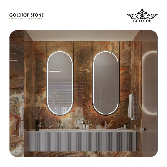 粉红星尘石英岩捕捉了自然界动感的诗意之美。其温暖的棕色底色宛如落日余晖,流动的灰蓝色纹理则令人联想起天空中飘浮的云朵。玫瑰金和柔和的绿色交织在一起,如同雨后彩虹,营造出浪漫而变幻莫测的视觉体验。每一块石板都是天然的杰作,色彩过渡丰富,艺术气息浓厚。